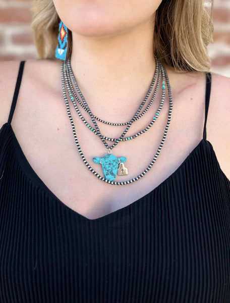 Navajo pearl necklace with turquoise cow head