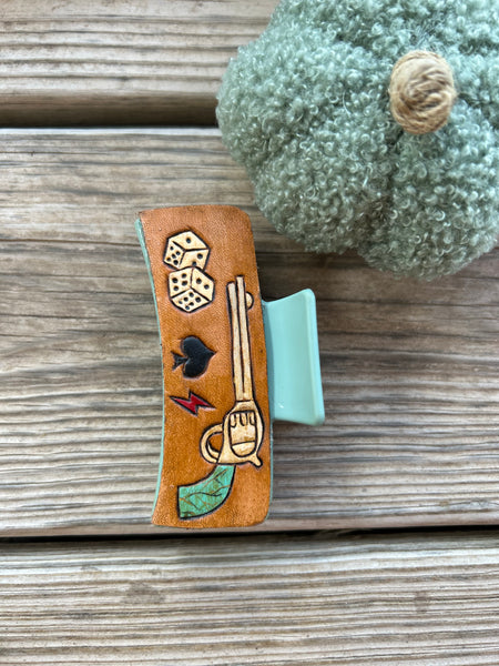 Hand tooled leather on revalue size claw clip